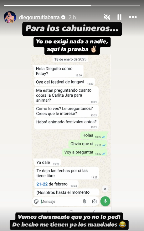 Sin embargo, Diego Urrutia respondió a las acusaciones a través de sus redes sociales. El humorista compartió un pantallazo de una conversación previa al festival, donde una persona de la producción consultaba por el interés de Carla Jara en animar el evento. Junto a la imagen, Urrutia escribió en tono irónico: “Vemos claramente que yo no lo pedí, de hecho me tienen para los mandados”.