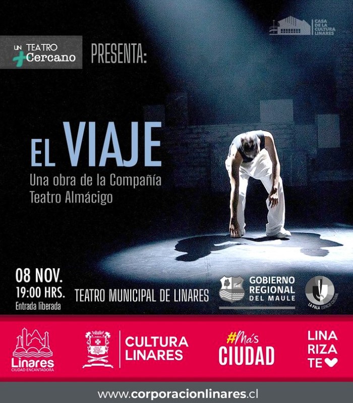 El próximo 08 de noviembre a las 19 horas, en el Teatro Municipal de Linares será la presentación de la obra “El Viaje”, desarrollada íntegramente por la compañía Teatro Almácigo, compuesta por artistas longavianos, que esperan con ilusión un buen recibimiento por parte del público. La entrada es gratuíta y se ruega puntualidad en la llegada al evento.