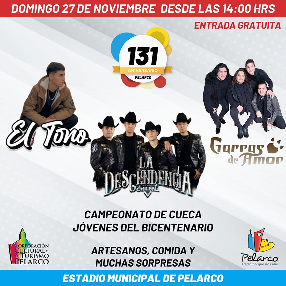 Para finalizar la jornada, la agrupación de música ranchera La Descendencia Chilena, promete clausurar por lo alto esta semana de aniversario pelarquino. La invitación es a toda la comunidad a disfrutar de este evento gratuito por la celebración de los 131 años de Pelarco.