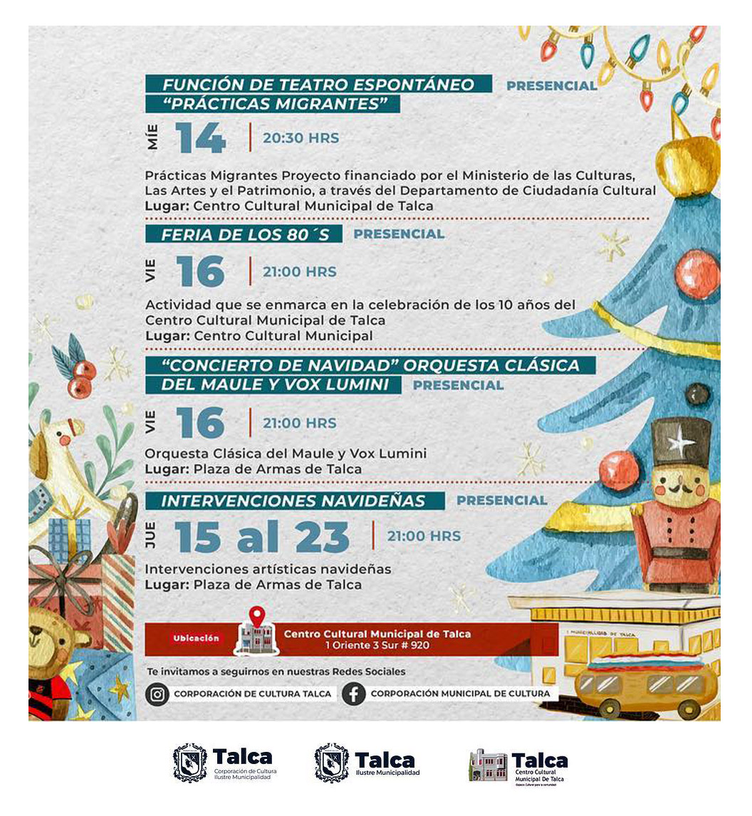 A contar del próximo miércoles 14 de diciembre, se presentarán de manera gratuita una serie de presentaciones culturales y recreativas, algunas en celebración de los 10 años del Centro Cultural Municipal de Talca. Se realizarán shows de teatro, ferias con exponentes y venta de artesanía, además de conciertos e intervenciones navideñas.