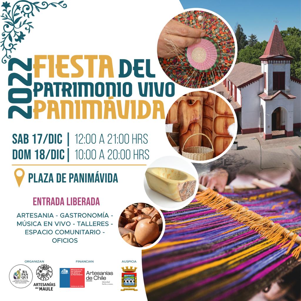 La inauguración de esta “Fiesta del Patrimonio Vivo 2022” que se realizará en la Plaza de Panimávida, se efectuará el sábado 17 de diciembre a las 12:00 horas abriendo su gran muestra artesanal al público, la que el día domingo 18 de diciembre desde las 10:00 horas también comenzará su funcionamiento, un gran panorama para el cual se están coordinando todos los detalles, para que vecinos y turistas puedan disfrutar de esta turística localidad de Colbún y de música, artesanía y gastronomía.