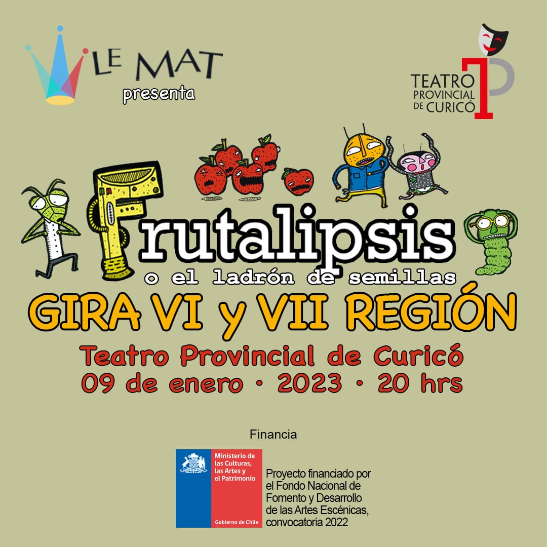 La comunidad de Curicó tendrá la posibilidad de disfrutar de un espectáculo infantil único, de la mano de la obra “Frutalipsis, o el ladrón de semillas”, creada por la compañía de teatro Le’Mat, que se presentará en el Teatro Provincial de la ciudad maulina.