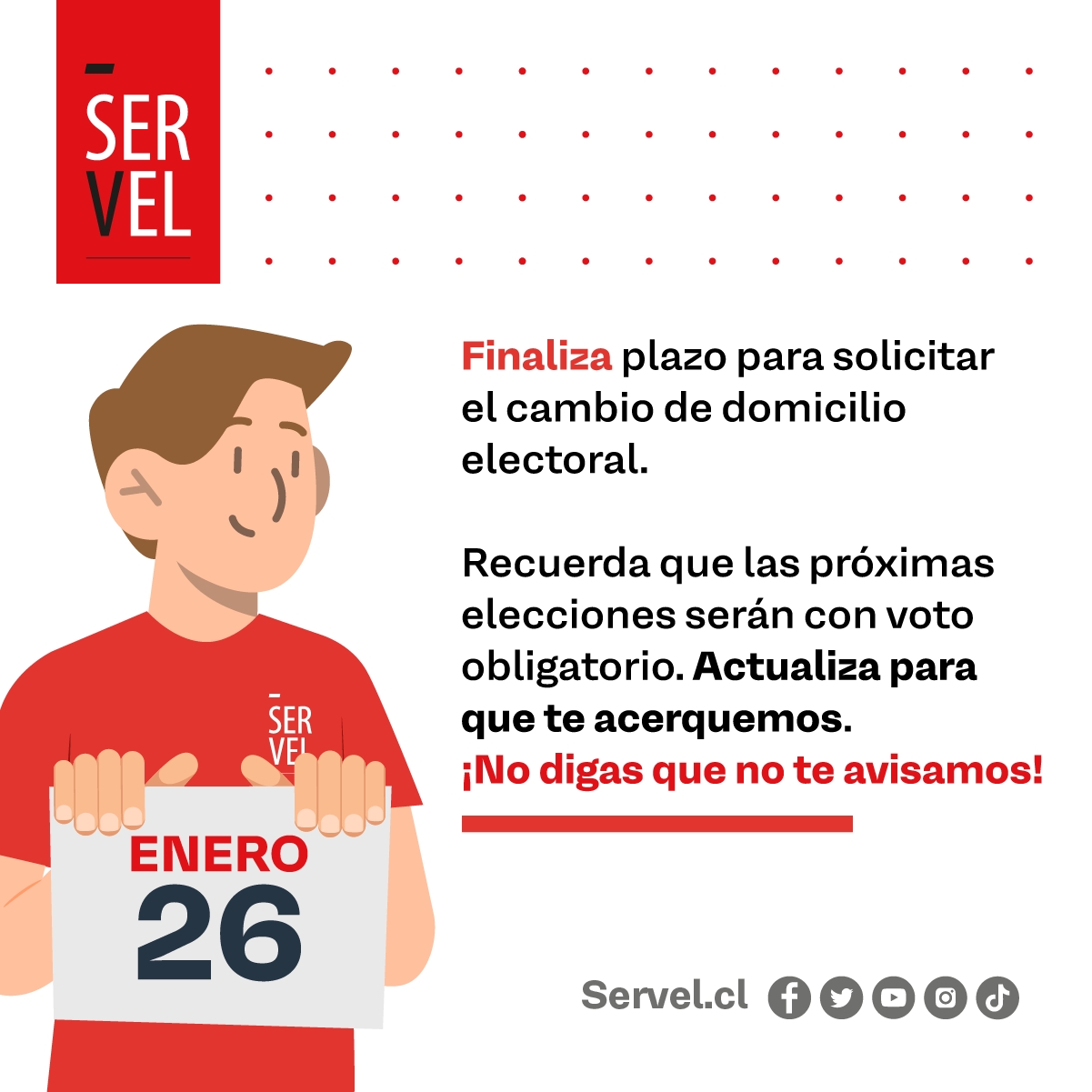 Con el retorno del voto obligatorio, más que nunca es indispensable mantener actualizada la información domiciliaria de cada votante, para que de esta manera se eviten errores y problemas futuros cuando a la ciudadanía le toque ejercer su deber cívico. Es por este motivo que el Servel hace un llamado a todos los ciudadanos habilitados para sufragar a corroborar que esta información solicitada, esté correcta. De no ser así deben actualizar estos datos antes del 26 de enero a las 23:59 horas.