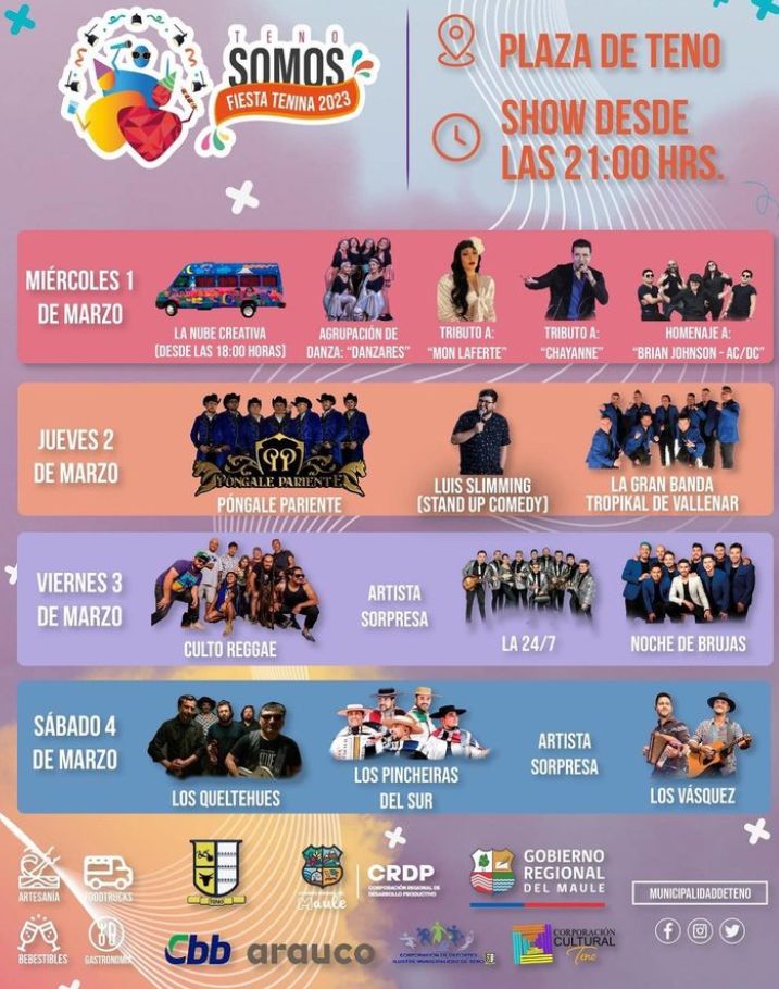 Desde el miércoles 1 de marzo en la Plaza de Armas de Teno, a las 21:00 horas se llevará a cabo esta actividad. La cual contará a lo largo de sus 4 días con humoristas, diversos exponentes musicales y dos artistas sorpresa.