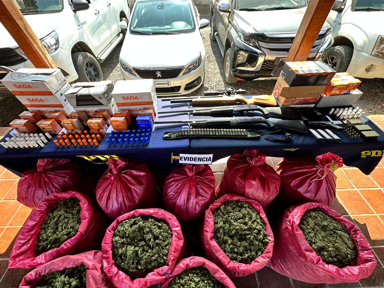 Seguidamente, se ejecutaron siete órdenes judiciales de entrada y registro para los domicilios de los investigados y lugares de acopio en las comunas de Molina y Teno, incautando 83 kilos 960 gramos de cannabis procesada, 11 plantas de la droga en proceso de crecimiento, 1 millón 555 mil pesos en efectivo, 2 escopetas de repetición, 1 pistola 9mm con 03 cargadores, 1 pistola 9mm a fogueo, 1 rifle de aire comprimido, 4 vehículos, 3.231 cartuchos de escopeta calibre 12, 117 cartuchos calibre 9mm y 100 cartuchos calibre 9mm de fogueo, entre otros elementos.