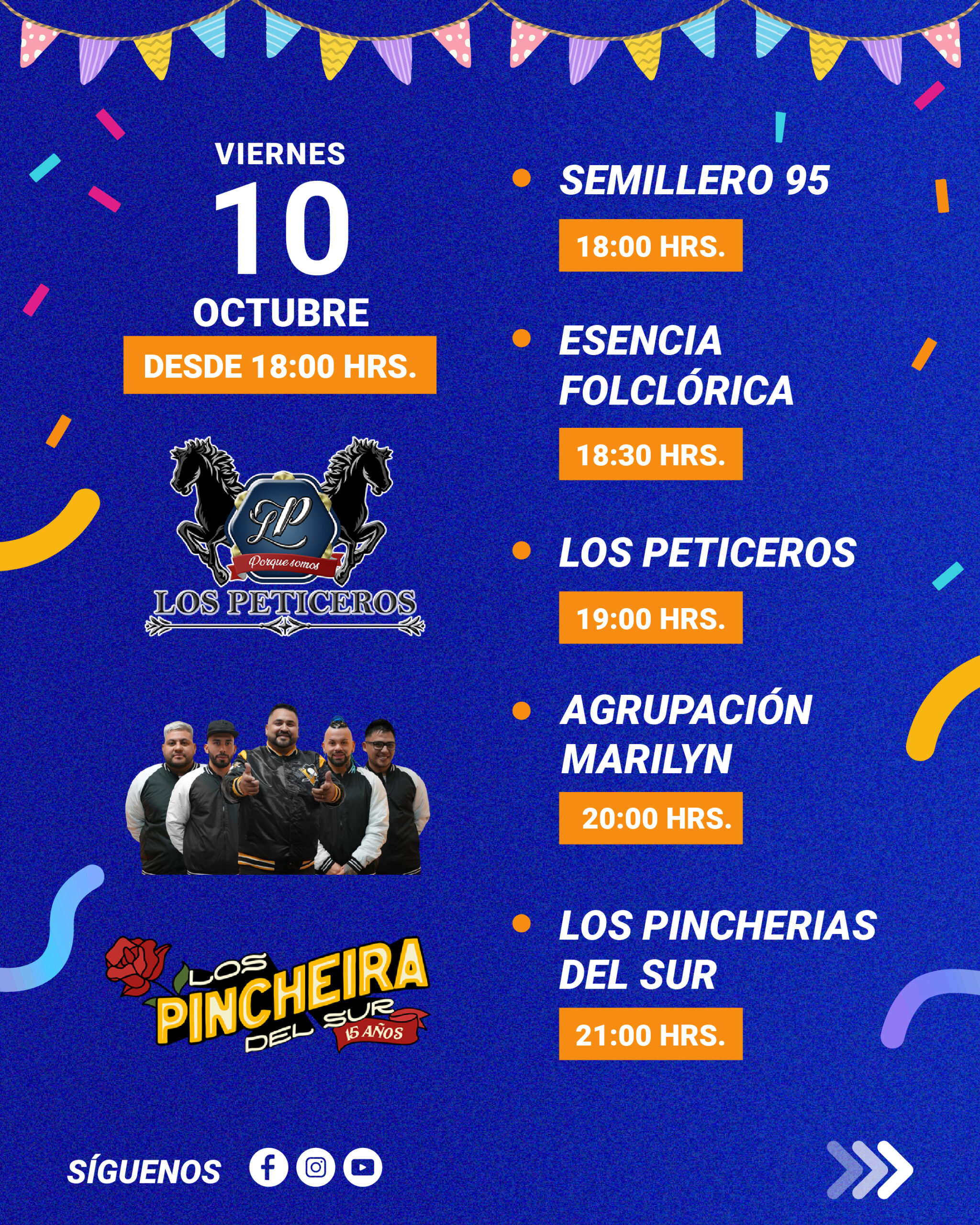 • Viernes 10: Los Pincheira del Sur, Agrupación Marilyn, Los Peticeros. Además, este día se realiza el desfile y la inauguración de las ramadas.
