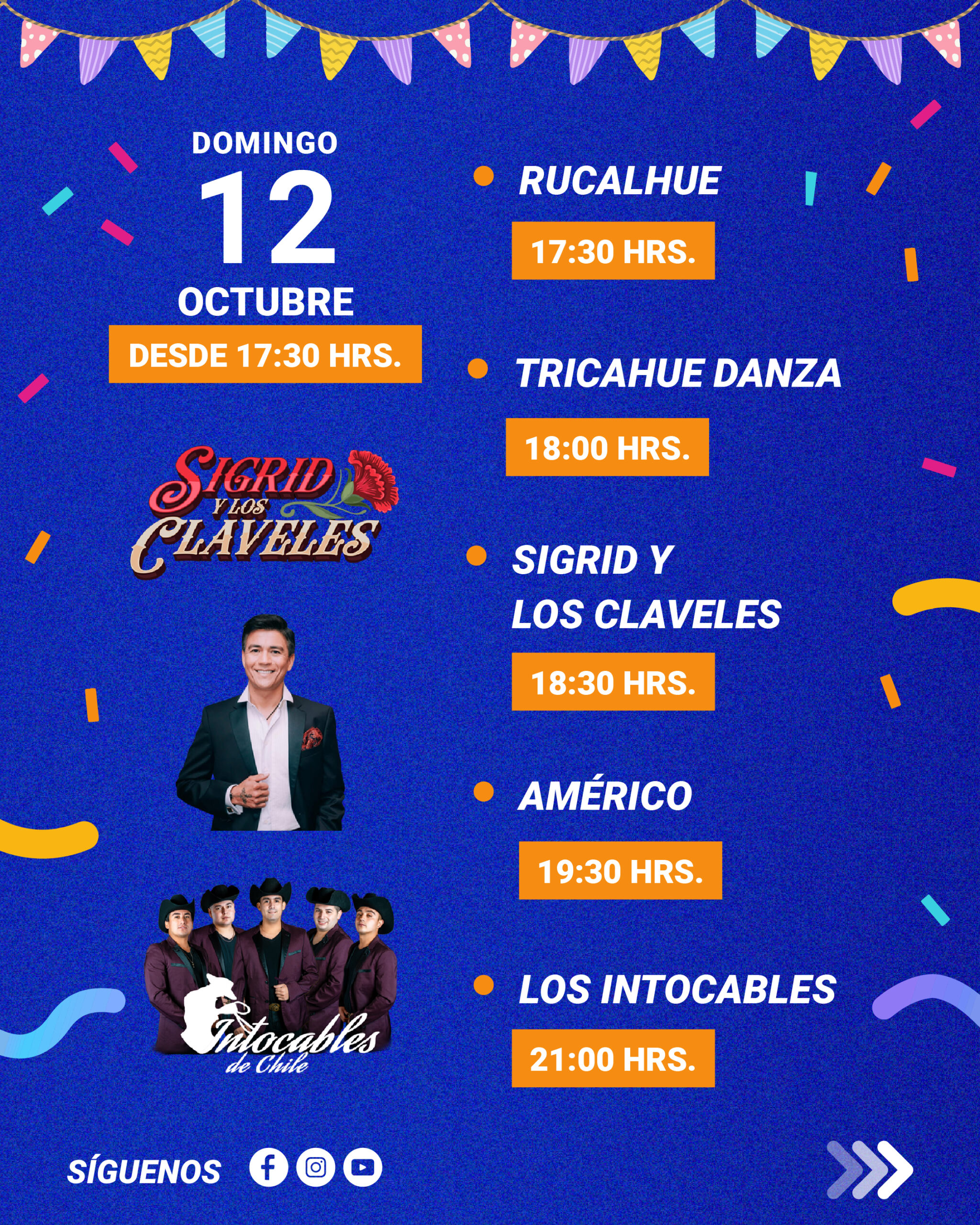 • Domingo 12: Sonora Palacios, Américo, Sigrid Alegría y Los Claveles, y el grupo Intocables de Chile.