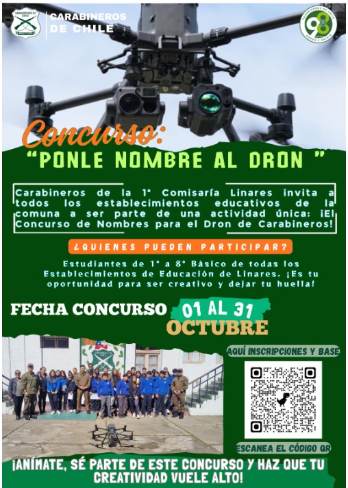 Carabineros de Linares invita a alumnos de 1° a 8° Básico a nombrar su dron de seguridad. Las propuestas se reciben hasta el 31 de octubre.