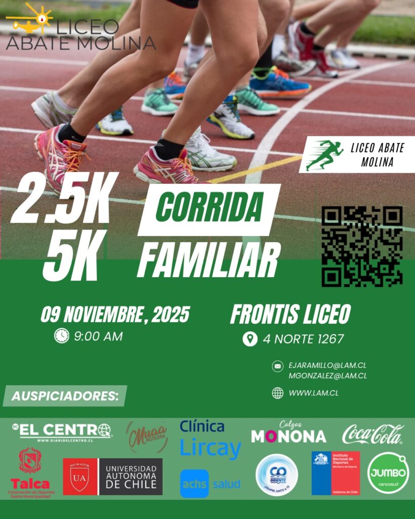 El Liceo Abate Molina de Talca anunció la realización de su Corrida Familiar 2025. El evento tendrá lugar el domingo 9 de noviembre, desde las 09:00 horas, en el frontis del establecimiento, ubicado en Avenida Alameda con 6 Oriente, en la capital regional.