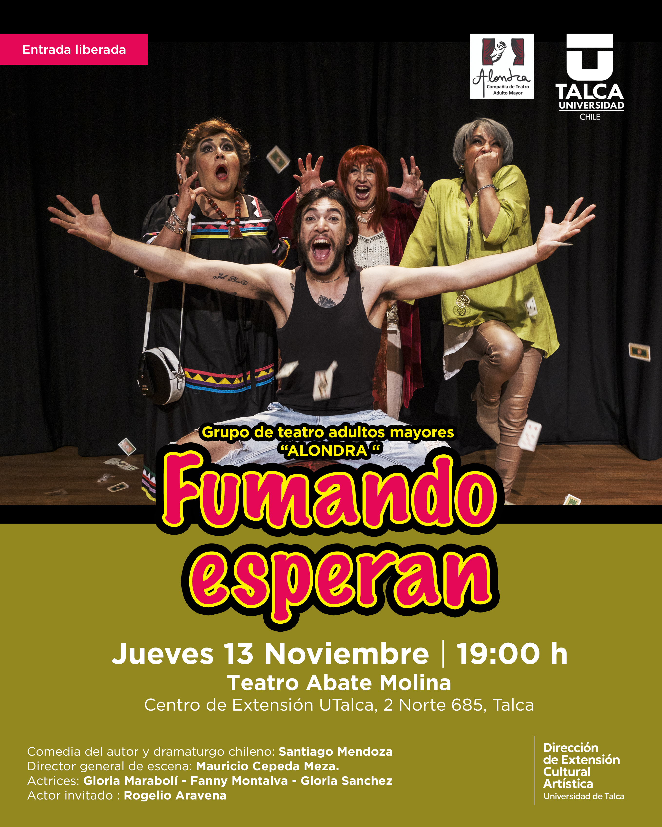 El reconocido elenco Teatro Alondra regresa a los escenarios talquinos con la comedia “Fumando Esperan”, escrita por Santiago Mendoza y dirigida por el destacado actor y director maulino Mauricio Cepeda Meza. La función se realizará este jueves 13 de noviembre, a las 19:00 horas, en el Centro de Extensión Universidad de Talca (2 Norte #685, Talca).