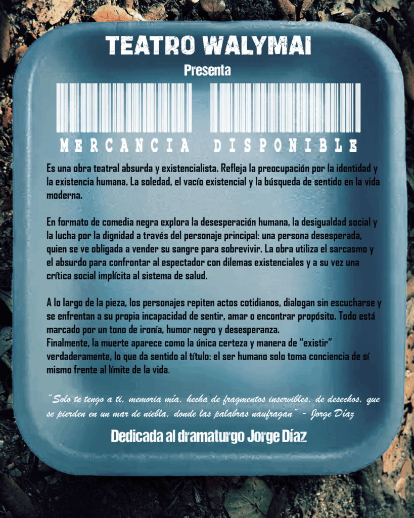 La Compañía de Teatro Walymai anunció el estreno de su nueva producción titulada “Mercancía Disponible”, una obra de tono absurdo y existencialista que invita al público a reflexionar sobre la identidad, la soledad y la búsqueda de sentido en la vida contemporánea. La función se presentará el jueves 20 de noviembre, a las 19:00 horas, en el Centro de Extensión de la Universidad de Talca, ubicado en 2 Norte con 1 Poniente, con entrada liberada.
