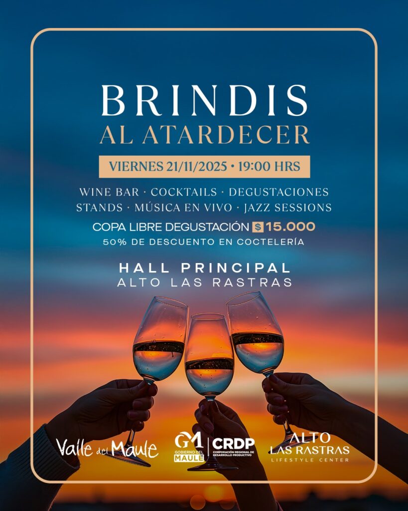 Talca prepara una jornada dedicada al encanto del espumante maulino con la realización de “Brindis al Atardecer”. Este evento se llevará a cabo este viernes 21 de noviembre, desde las 19:00 horas, en el Hall Principal de Alto Las Rastras.