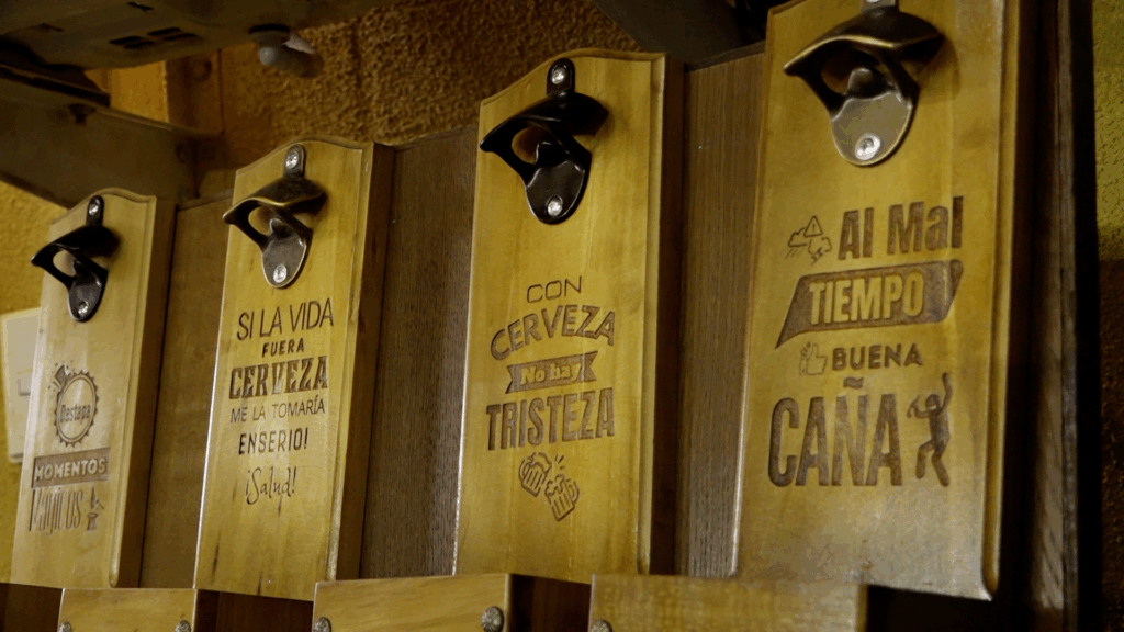 “Tenemos una amplia línea de productos: bares, porta vino, vasos cerveceros, cubas, destapadores, tablas de roble francés, tequileras y nuestros innovadores porta completos o porta choripán. También realizamos productos personalizados, como muebles, percheros, exhibidores y regalos corporativos con grabado láser”, comenta.