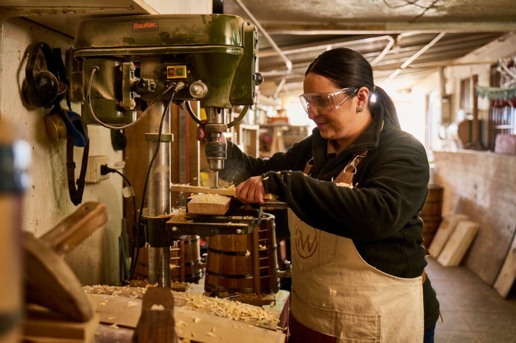“Estamos en Curicó, una zona vitivinícola del Maule. Aquí, como tonelero, podemos rescatar y crear productos que mejoran licores y vinos. Además, nuestra labor refleja la identidad local, conectando tradición y patrimonio con la calidad de los productos”, señala Patricia.