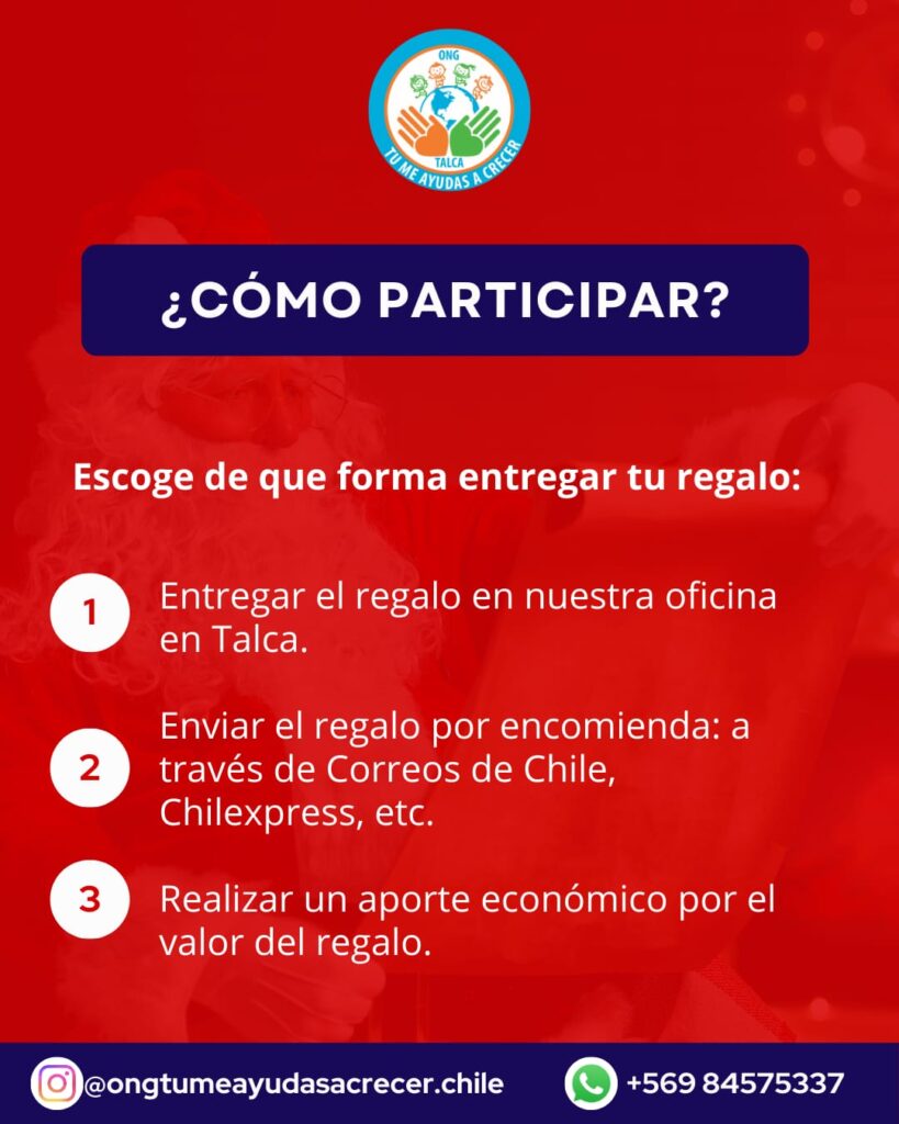 La campaña contempla tres formas de colaboración. Una es entregar el obsequio directamente en la oficina de la ONG en Talca. Otra opción es enviarlo por encomienda a través de servicios como Correos de Chile o Chilexpress. También está la alternativa de realizar un aporte económico equivalente al valor del regalo solicitado.