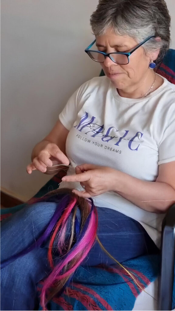Les digo que cada pieza lleva historia. Mi mamá es artesana y todo nació de una necesidad: antes las mujeres tejían para comprar lo básico. Cada creación tiene nuestra historia y el orgullo de mi familia. En esta zona siempre hubo artesanas incluso los hombres tejían en invierno por falta de trabajo, por eso cada pieza de crin mantiene viva una tradición muy bonita y llena de significado.