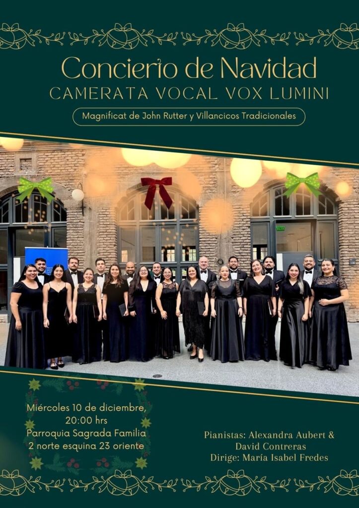 La Camerata Vocal Vox Lumini realizará este miércoles 10 de diciembre su Concierto de Navidad. Este es un encuentro musical que reúne el Magnificat de John Rutter y un programa de villancicos tradicionales. Es una jornada pensada para acercar la música coral a la comunidad talquina. La presentación se desarrollará a las 20:00 horas en la Parroquia Sagrada Familia de Talca, con entrada liberada.