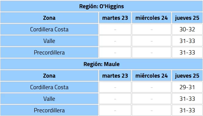 Para el día de Navidad, el pronóstico indica que las temperaturas se mantendrán elevadas en la región. Se espera que los registros estén cercanos a los 32 °C en comunas del valle central. Por su parte, la zona costera registrará temperaturas más moderadas, aunque por sobre los promedios habituales.