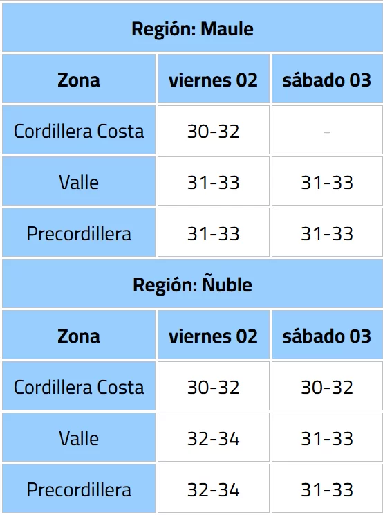 La Dirección Meteorológica de Chile emitió un aviso por altas temperaturas que se extenderá entre el viernes 2 y sábado 3 de enero, con máximas cercanas a 36 °C en Maule, Ñuble y Biobío.