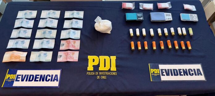 Con estos antecedentes, los detectives ejecutaron una orden de entrada y registro en un inmueble del sector Punta de Monte, en la comuna de Longaví. En el lugar, la policía incautó 336,59 gramos de clorhidrato de cocaína a granel, 20 cartuchos de escopeta calibre 12 sin percutar, dinero en efectivo, balanzas digitales y diversos elementos para la dosificación de droga.