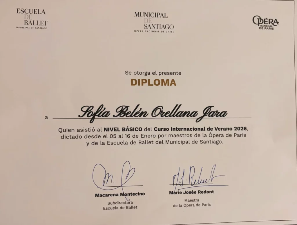 La bailarina y estudiante de la Escuela de Ballet Gonzalo Vera, de Talca, Sofía Belén Orellana Jara, fue seleccionada para participar en el Curso Internacional de Verano 2026 de la Escuela de Ballet del Teatro Municipal de Santiago.