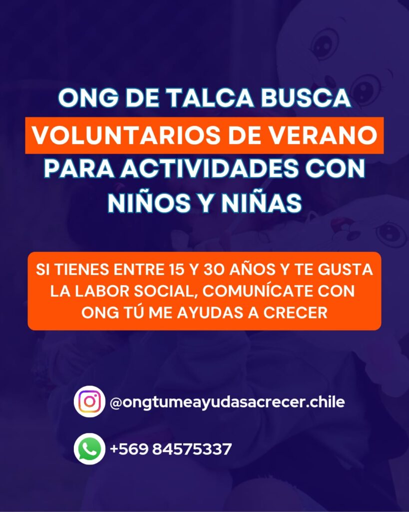 La ONG Tú me ayudas a crecer abrió la convocatoria para su voluntariado de verano. Está dirigida a jóvenes que deseen colaborar en actividades orientadas a niños, niñas y adolescentes en riesgo social de Talca.