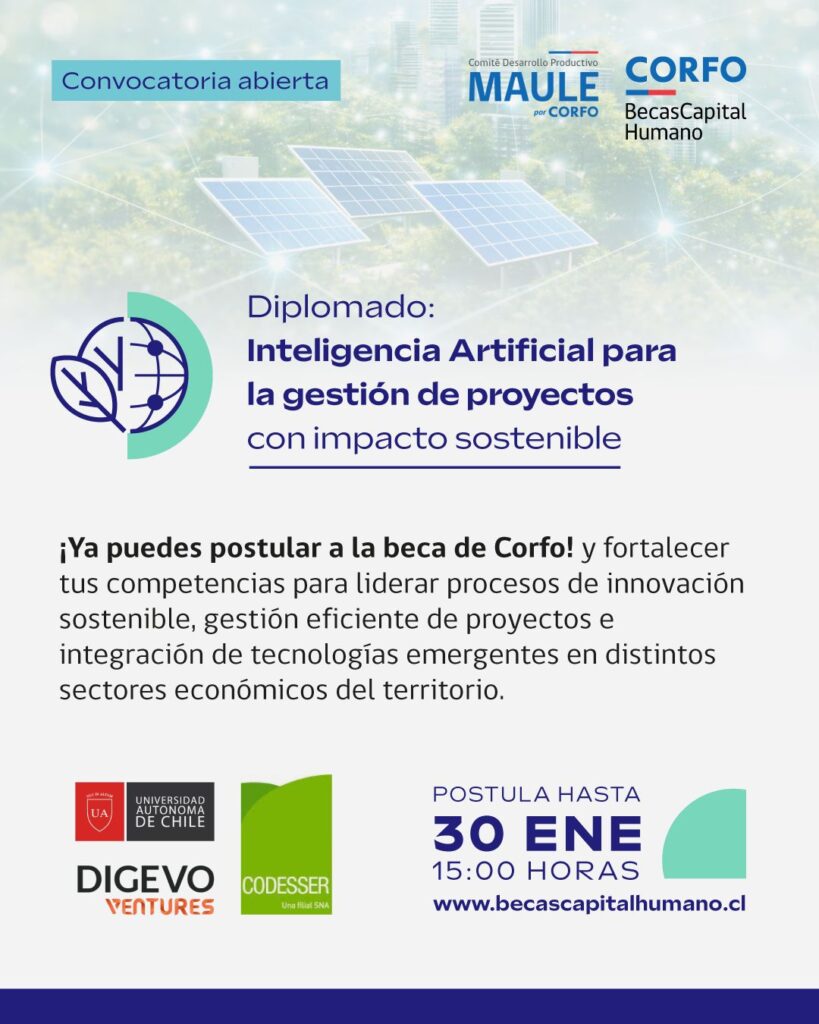 El proceso de postulación al Diplomado en Inteligencia Artificial para la Gestión de Proyectos con Impacto Sostenible (IAIS Maule) avanza hacia su cierre. La iniciativa cuenta con financiamiento de Corfo, a través de sus Becas Capital Humano, y ofrece una oportunidad concreta para fortalecer competencias estratégicas en la región.