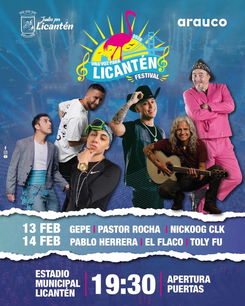 El Festival Una Voz para Licantén 2026 reunirá a destacados exponentes de la música chilena los días 13 y 14 de febrero, desde las 19:30 horas, en el Estadio Municipal.