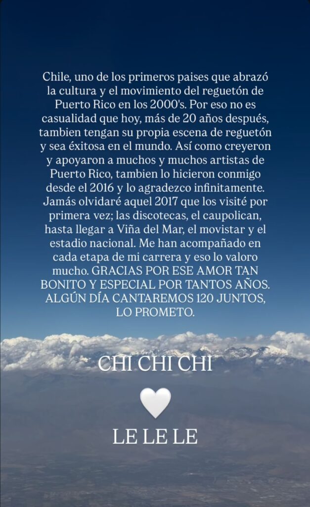 El artista utilizó su cuenta de Instagram para reconocer el rol que ha tenido el público chileno en su trayectoria y en la expansión del reguetón fuera de Puerto Rico. “Chile fue uno de los primeros en abrazar la cultura y el movimiento del reguetón de Puerto Rico en los 2000’s”, escribió, destacando el vínculo que mantiene con el país desde hace más de una década.