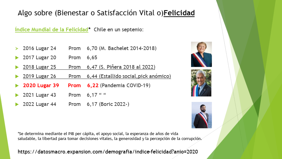 El indice de felicidad se determina mediante varios indicadores, el PIB per cápita, el apoyo social, la esperanza de años de vida saludable, la libertad para tomar decisiones vitales, la generosidad y la percepción de la corrupción. Más de la mitad de los 136 países clasificados experimentaron aumentos estadísticamente significativos, y 41 presentaron descensos significativos. La evolución de Chile en las últimas tres presidencias es la siguiente: