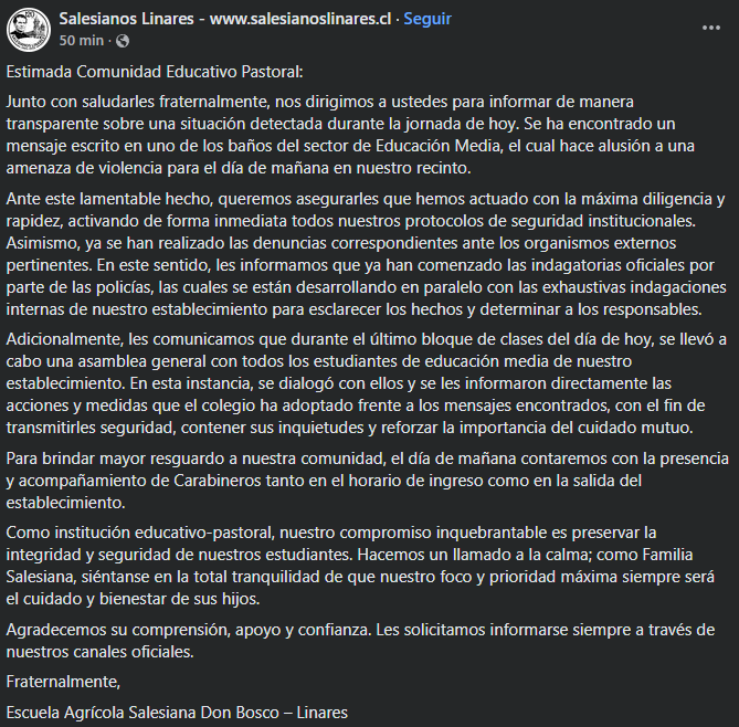 Un mensaje con contenido amenazante encontrado en los baños del sector de Educación Media del Colegio Salesianos de Linares encendió la preocupación en la comunidad educativa durante las últimas horas. El hecho motivó la activación inmediata de los protocolos de seguridad institucional.