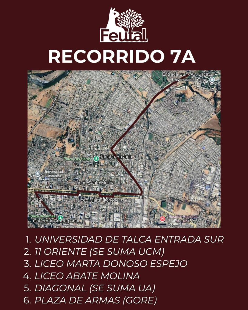Una masiva movilización estudiantil se desarrollará este martes 7 de abril en la ciudad de Talca, bajo la consigna “7A”, convocada por federaciones universitarias y centros de alumnos de liceos emblemáticos. La marcha comenzará a las 13:00 horas desde el Campus Lircay de la Universidad de Talca, punto de inicio de un recorrido que contempla distintos sectores de la capital regional.