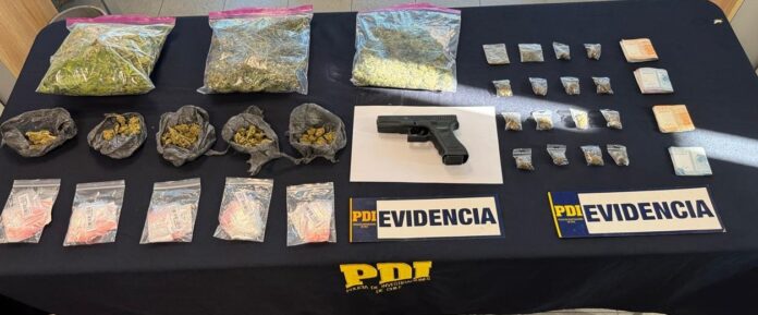 Durante el operativo, la PDI incautó 924,06 gramos de cannabis, además de cinco plantas en proceso de crecimiento, evidenciando la producción y dosificación de la sustancia ilícita. Asimismo, los oficiales decomisaron dinero en efectivo, un teléfono celular y una pistola a fogueo con cargador, junto a 13 cartuchos calibre 9 milímetros.