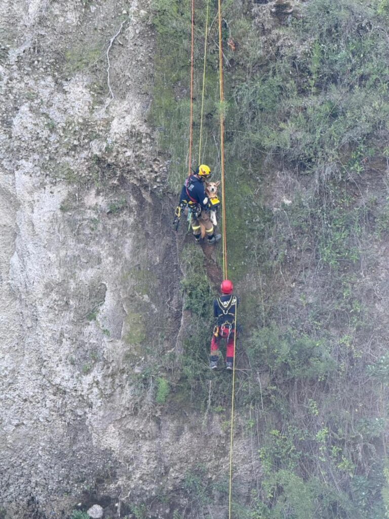 Tras un complejo operativo en Potrero Grande, Bomberos y equipos de apoyo lograron rescatar con éxito a un perro atrapado en una ladera, dejándolo sin lesiones.